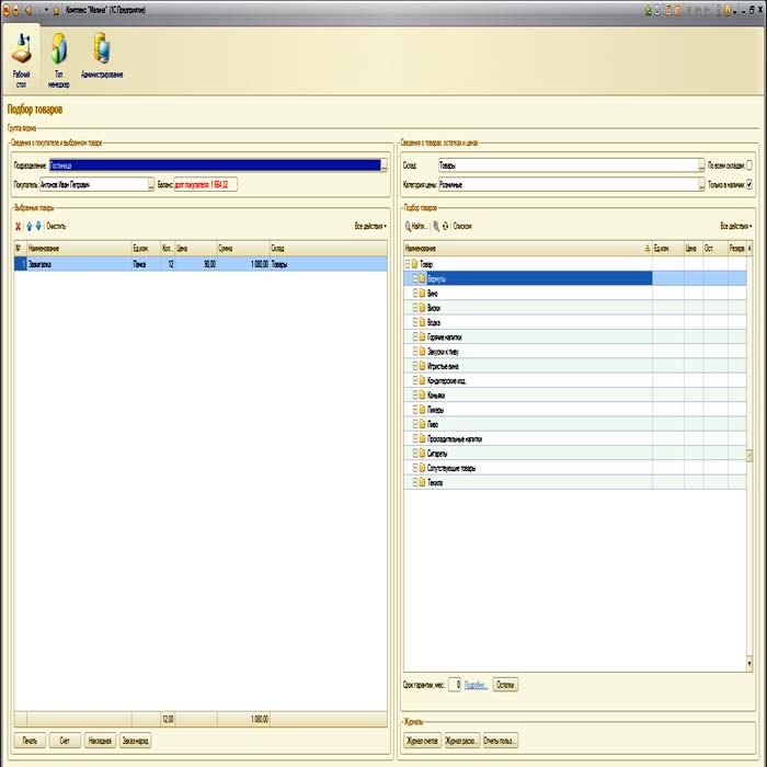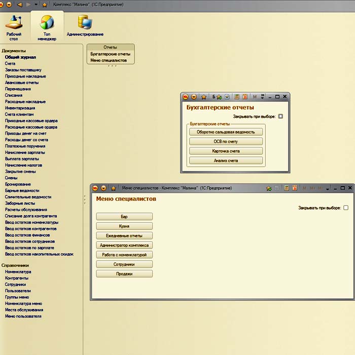 • возможность автоматического формирования по результатам смены документов: "Начисление зарплаты", "Барная ведомость", "Сличительная ведомость", "Заборный лист"